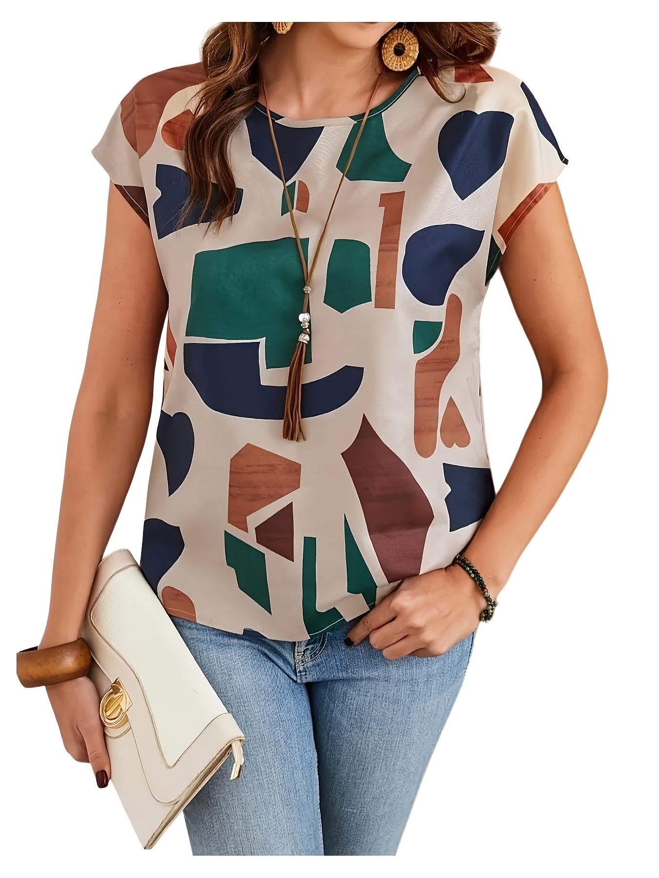 Women's Elegant Geometric Print Short Sleeve Blouse - Breathable Summer Fabric, Regular Fit Round Neck Top for Casual, Office & Casual Attire, Casual Summer Outfit, Smooth Texture Fabric