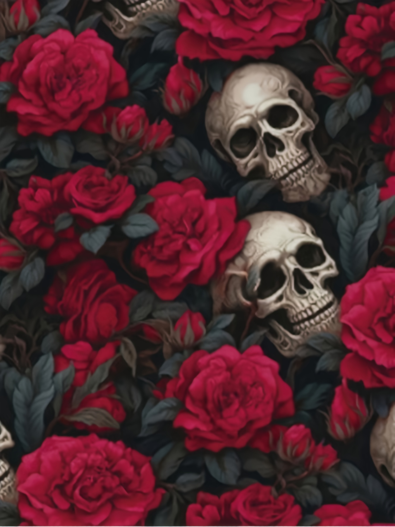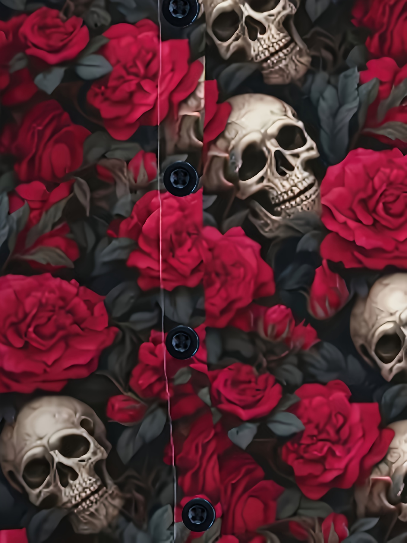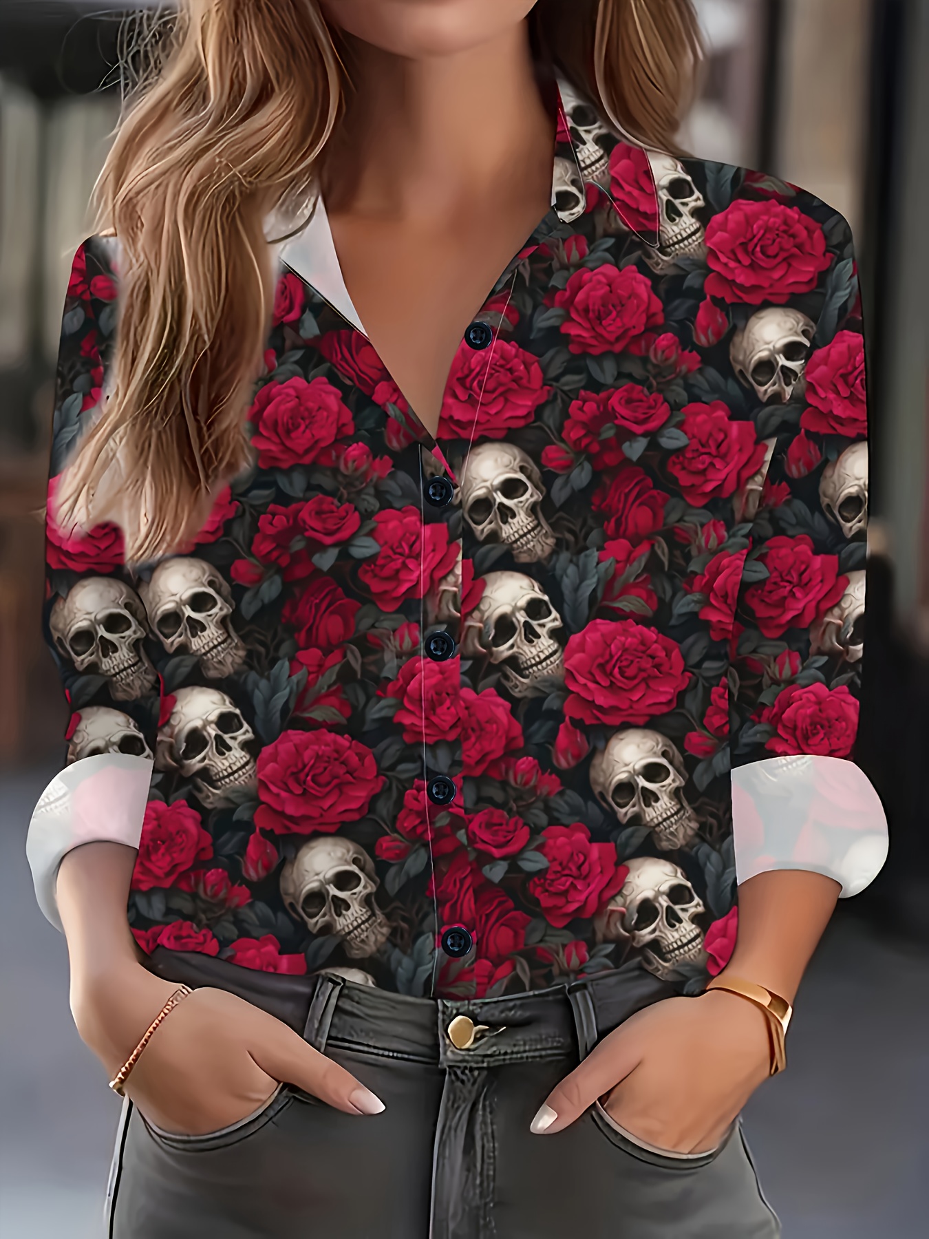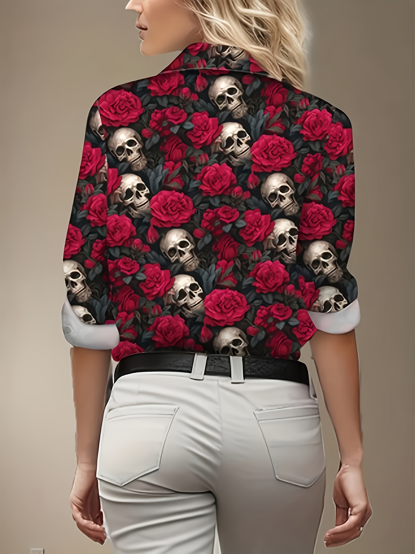 Women'S Gothic Floral & Skull Print Blouse - Red Roses & Skulls on Red Background, All-Season Casual Shirt with Collar & Button Front, Non-stretch Fabric For Halloween, Parties, Everyday Outfits - Women'S Clothing, Halloween Clothes, Party Attire