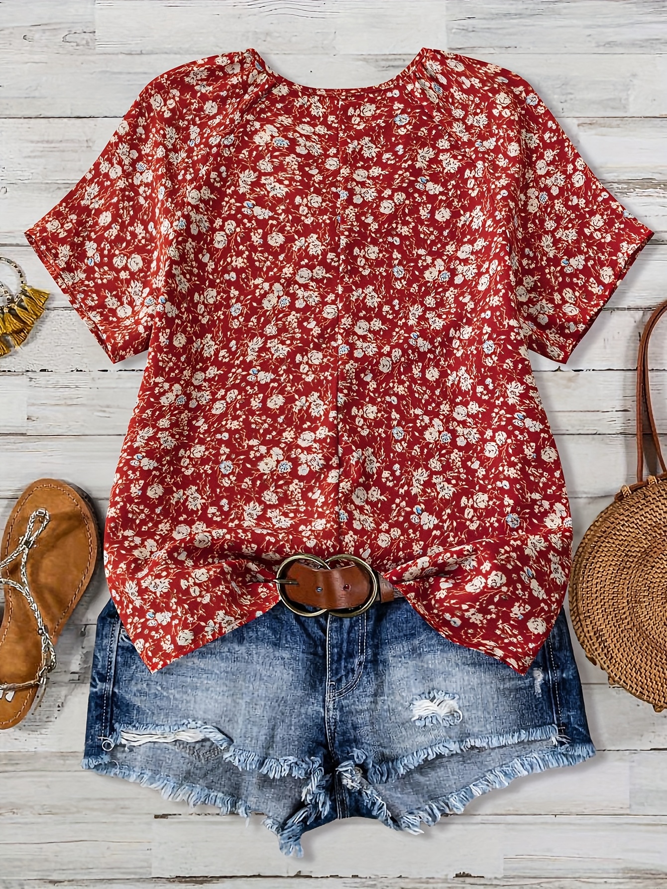 Women'S Red & White Floral Print V-Neck Short Sleeve Blouse - Lightweight Summer Shirt with Relaxed Fit, Machine Washable Nontransparent Fabric, Elegant Casual Top for Beach Outfits, Casual Attire & Semi-Formal Events, Breathable V-Neck Design with