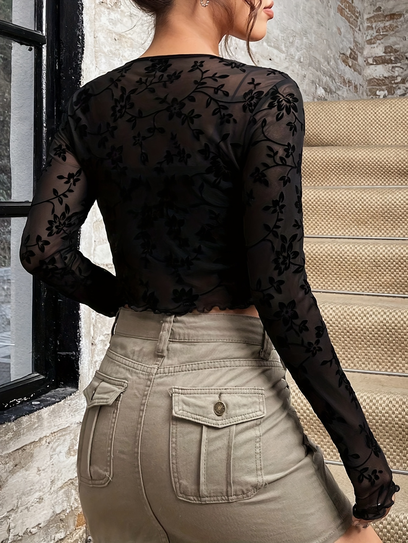 Women's Semi-Sheer Blouse with Botanical Leaf Print & Adjustable Tie-Front - Lightweight All-Season Lace-Like Sheer Panel Shirt, Hand Washable Elegant Casual to Dressy Tops (Plant Pattern)