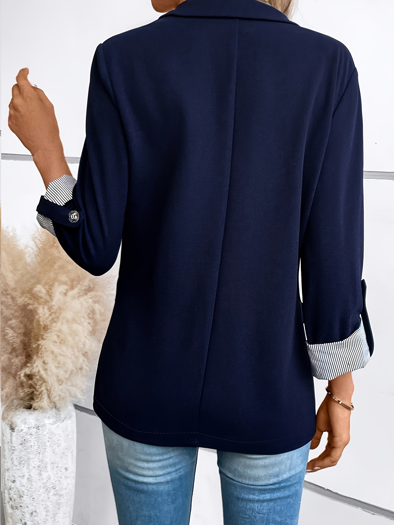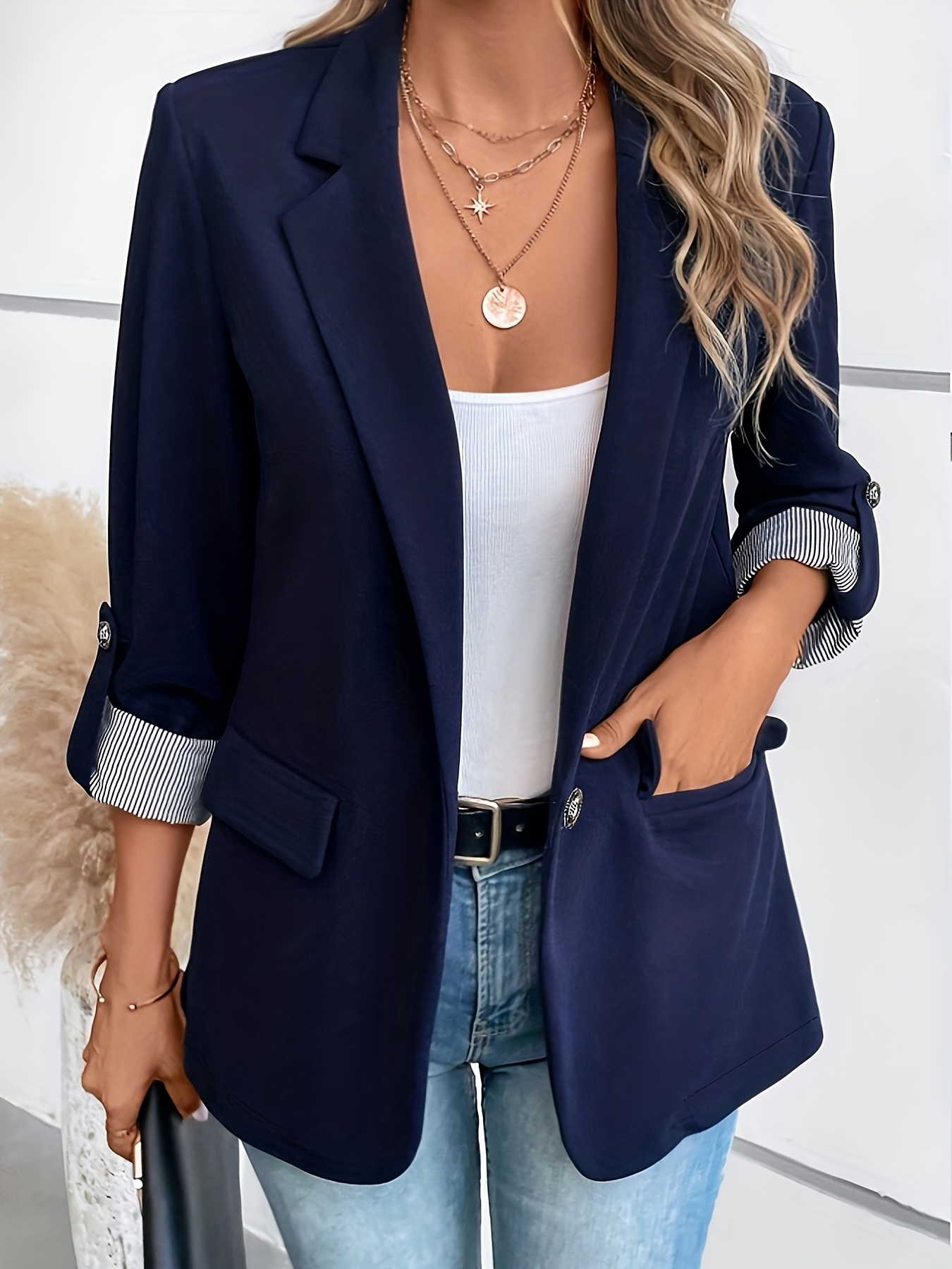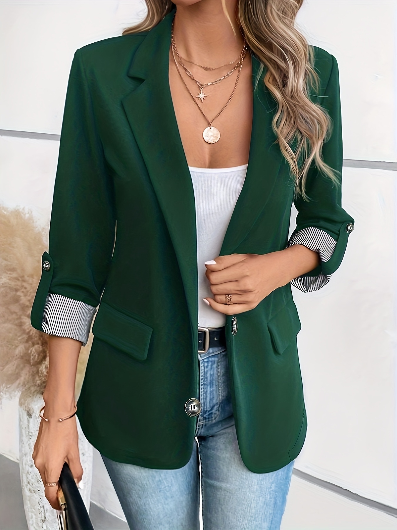 Women's Elegant Solid Black/White Lapel Blazer Jacket - Structured X-Line Single-Button Closure Work Suit Coat with Fake Pockets, Machine Washable Professional Office & Commuter Attire, Year-Round Tailored Outerwear