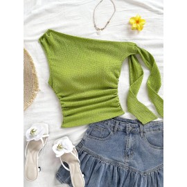 Women's Elegant Blouse with Asymmetric One-Shoulder Neckline & Ruffled Hem - Slim Fit Top, Medium Stretch Solid Color Shirts for Year-Round Wear, Machine Washable for, Semi-Formal or Party Outfits