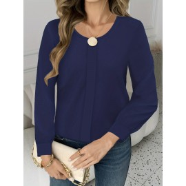 Women'S Elegant Long Sleeve Blouse - Solid Navy Round Neck Loose Fit Shirt with Piping Trim, Structured Collar & Button Front Closure, All-Season Casual to Formal Tops for Office, Semi-Formal & Casual Attire - Versatile Women'S Clothing