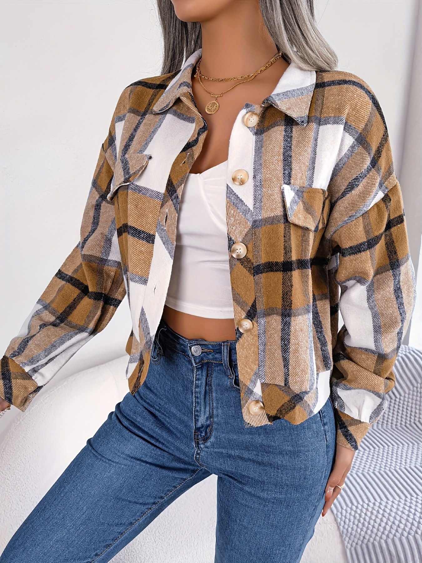 Women's Elegant Structured Jacket - Plaid Checkered Coat (Red/White/Tan) with Classic Collar & Chest Pocket Button Closure, Machine Washable Long Sleeve Blazer for Office, Casual or Formal Wear - Spring/Autumn Outerwear