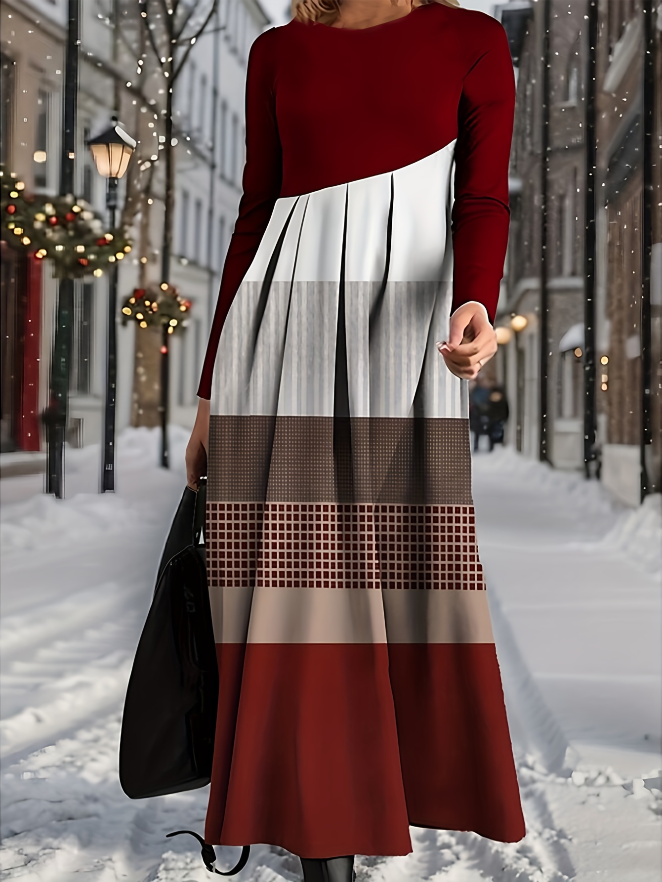 Women's Red Retro Geometric Stripe Patchwork Dress - Long Sleeve Round Neck High Waisted Winter Dress with Red/neutral tones, Machine Washable Party Wedding New Year's Eve Gala Attire