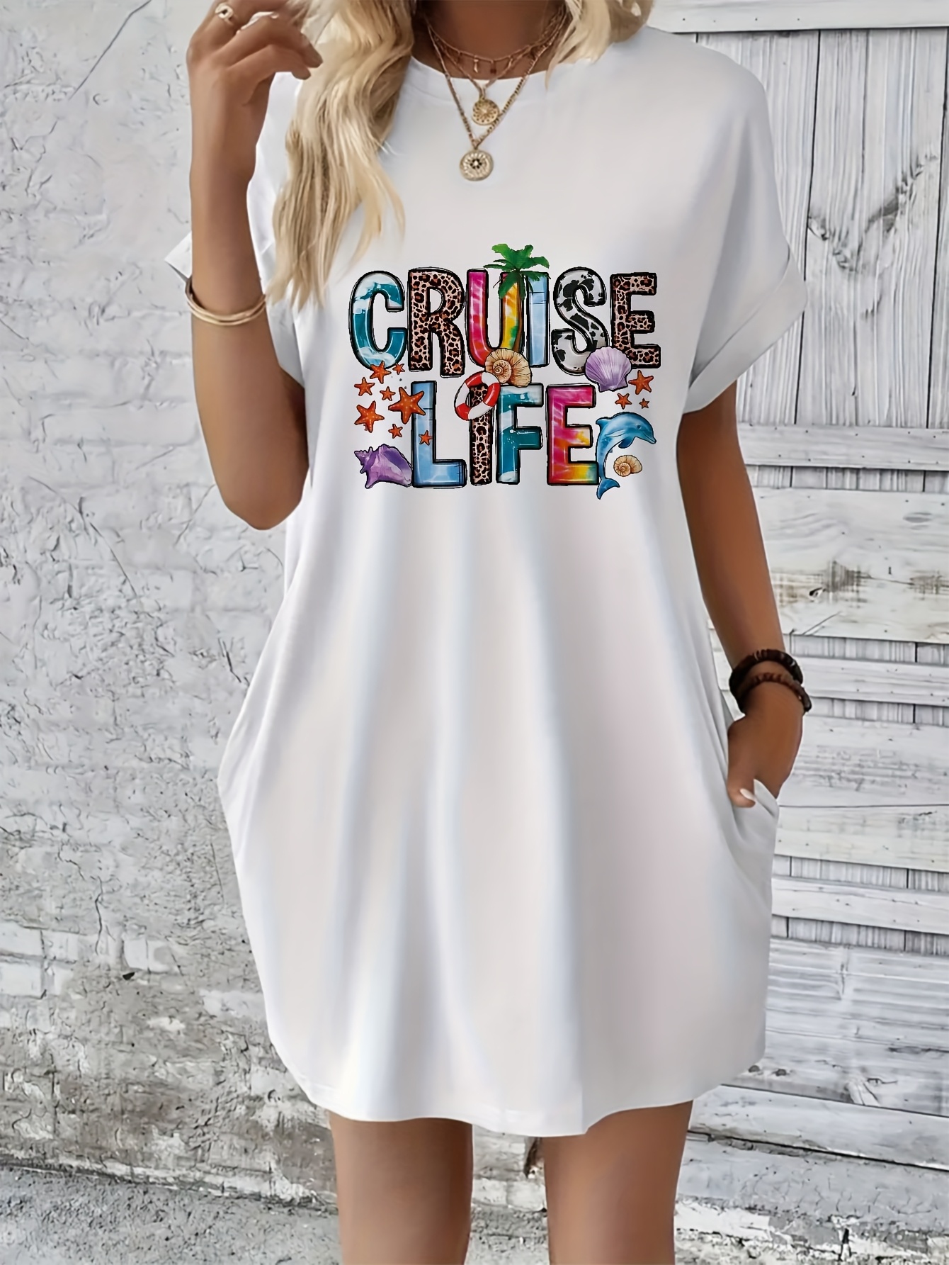 Women's Tropical Vacation Dress - Dark Grey T-Shirt Dress with Cruise Life Graphic, Short Sleeve Beach Outfit, Machine Washable Casual Summer Dress for Women, Beach Dress, Spring Fashion, Relaxed Fit, Comfortable Fabric, Travel Essentials, Holiday Outfit, Lightweight Material, Women's Fashion