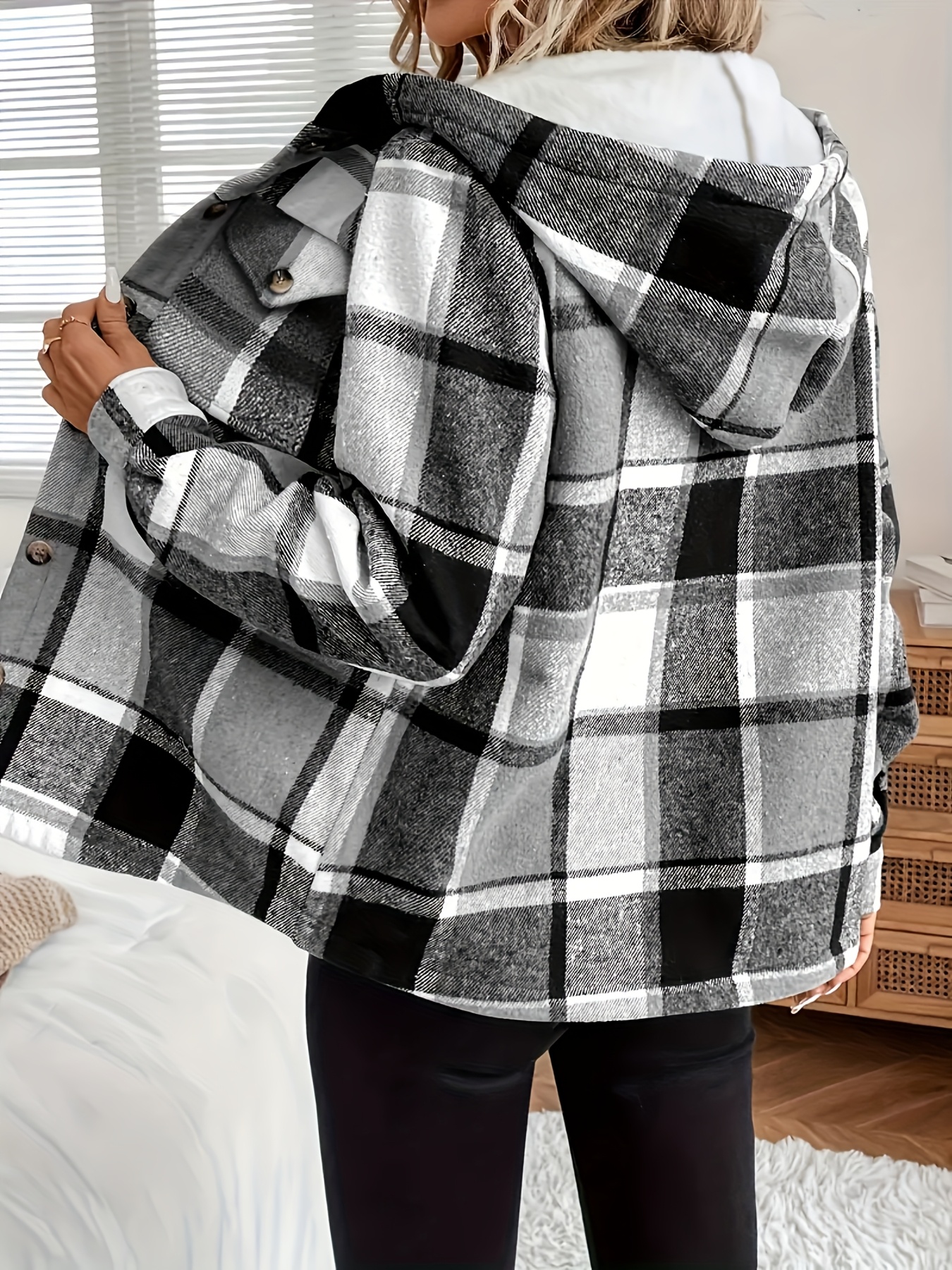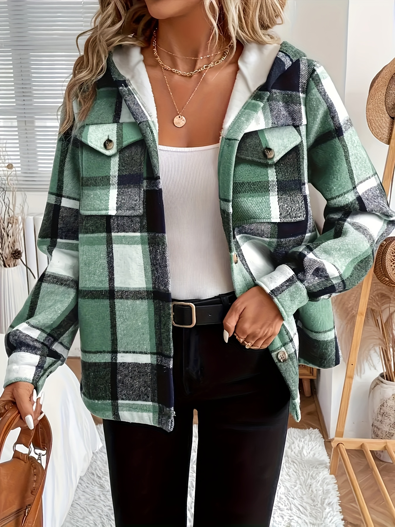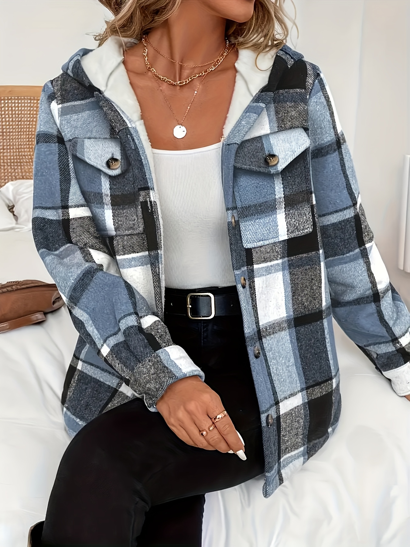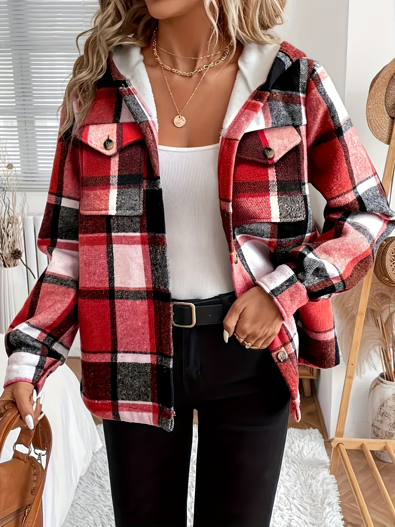 Women's -Lined Plaid Shirt Jacket - Warm Thick Winter Coat with Button Front Closure, Longline Fall Outerwear, Machine Washable Casual Blouse for Christmas & Cold Weather