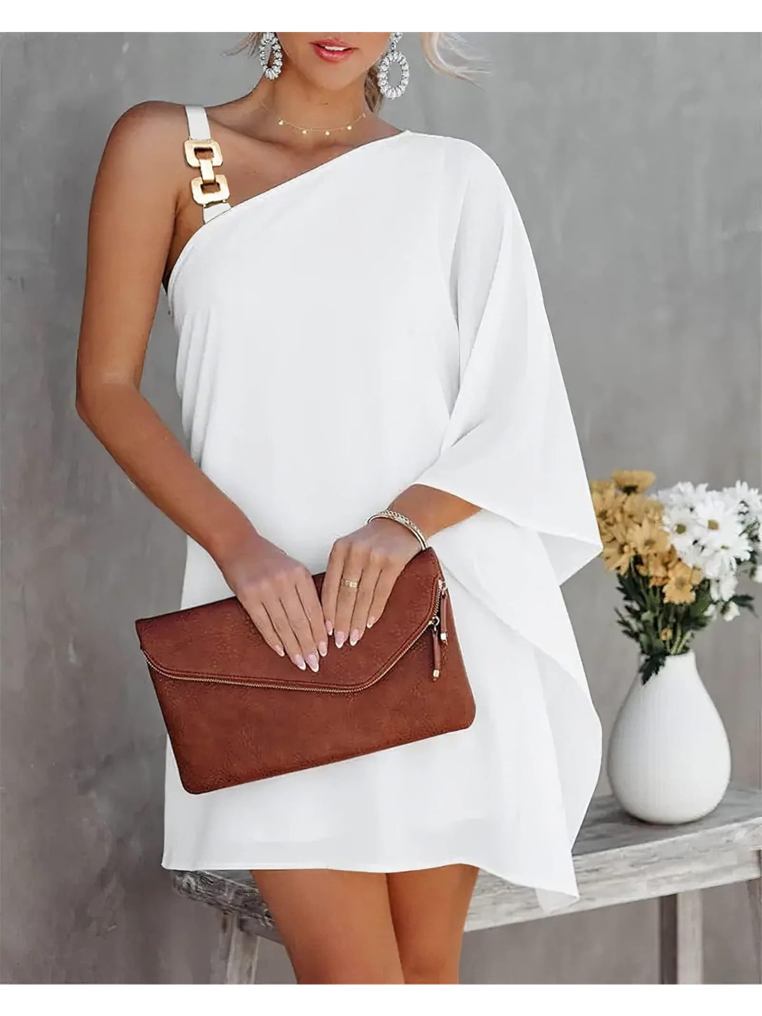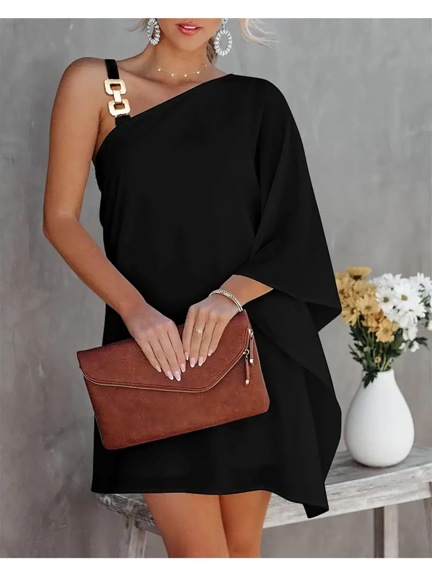 Women'S Elegant One Shoulder Black Midi Dress with Batwing Sleeves & Chain Accent - Boho to Semi-Formal Fitted Top & Flowy Skirt, Asymmetrical Hem, No - Fall/Winter Party Wedding Semi-Formal Attire (No Bra Padding, Natural Silhouette)