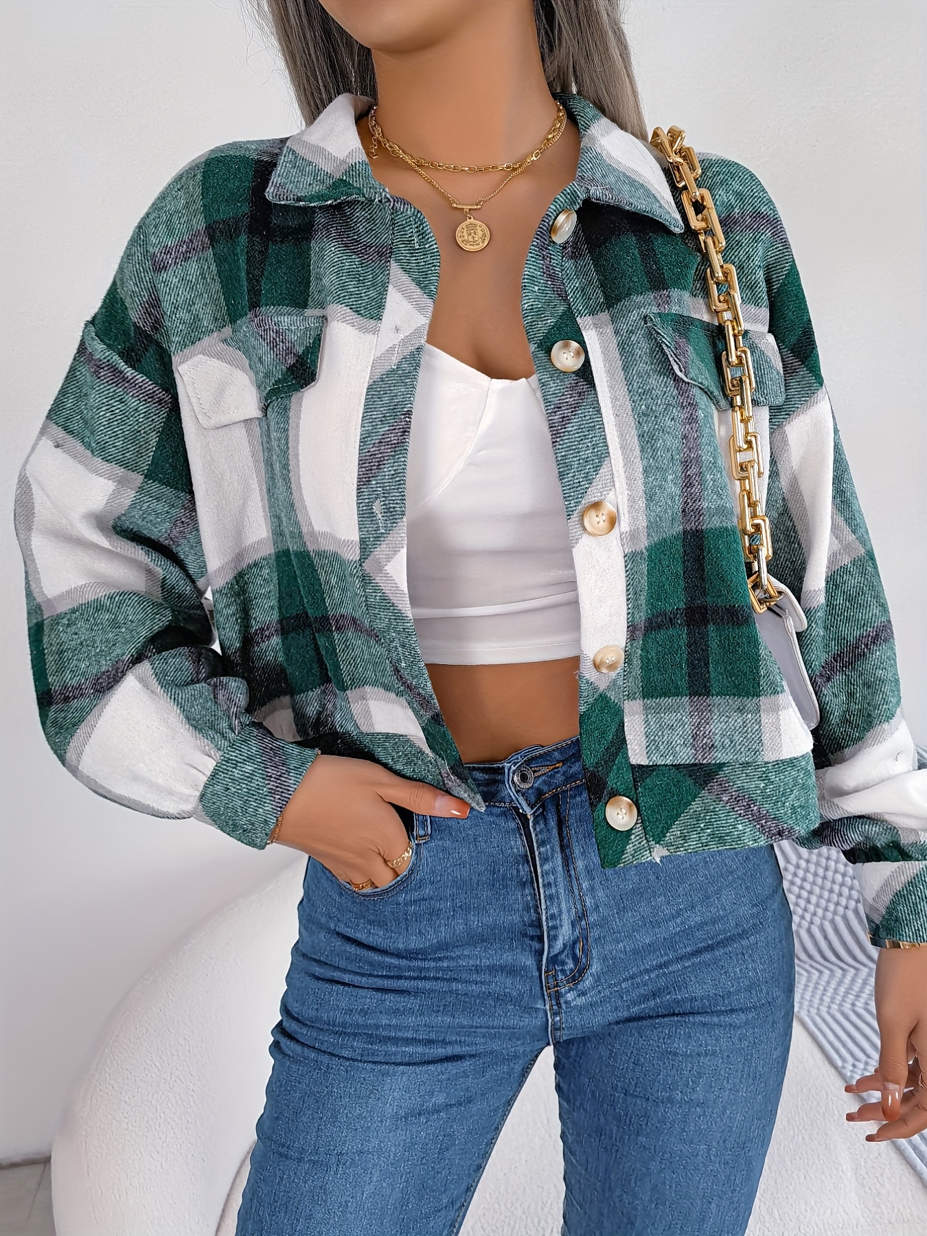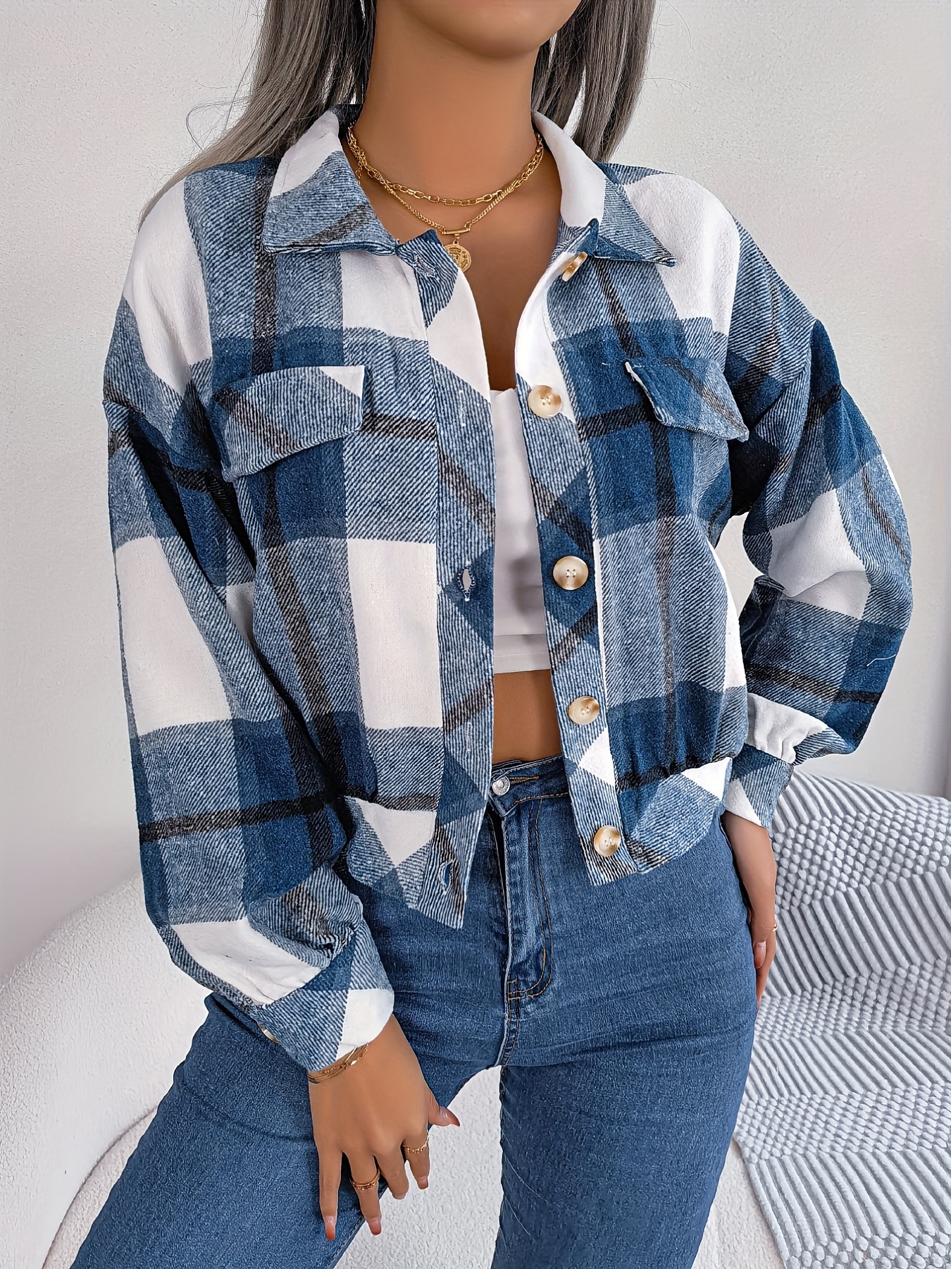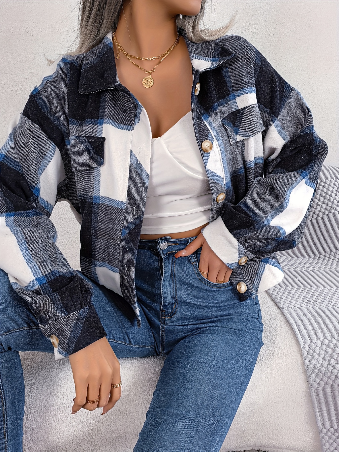 Women's Elegant Structured Jacket - Plaid Checkered Coat (Red/White/Tan) with Classic Collar & Chest Pocket Button Closure, Machine Washable Long Sleeve Blazer for Office, Casual or Formal Wear - Spring/Autumn Outerwear