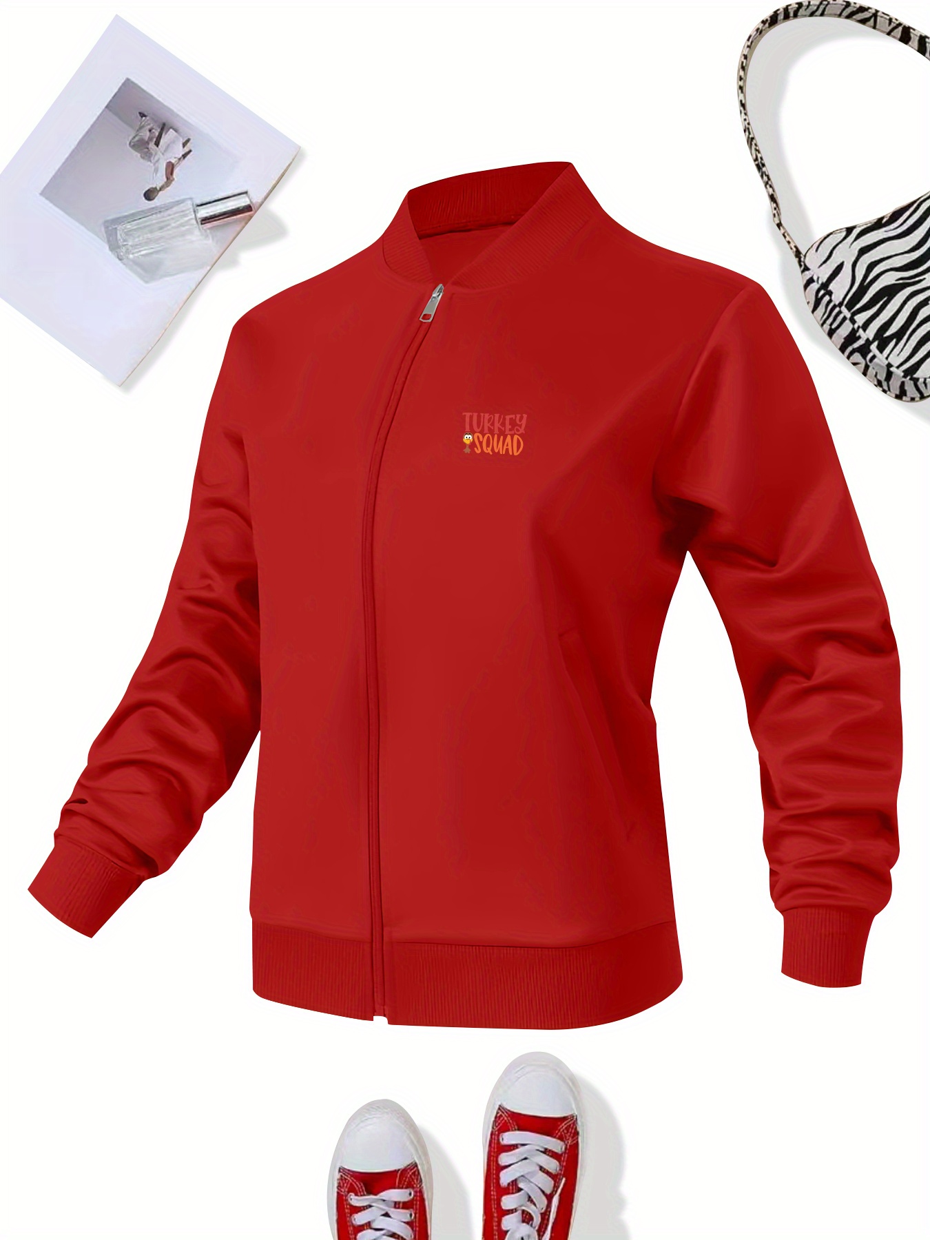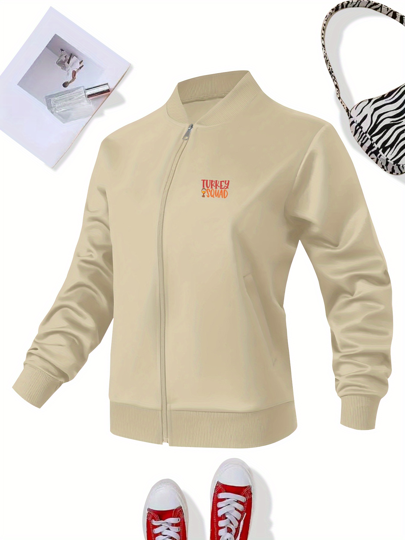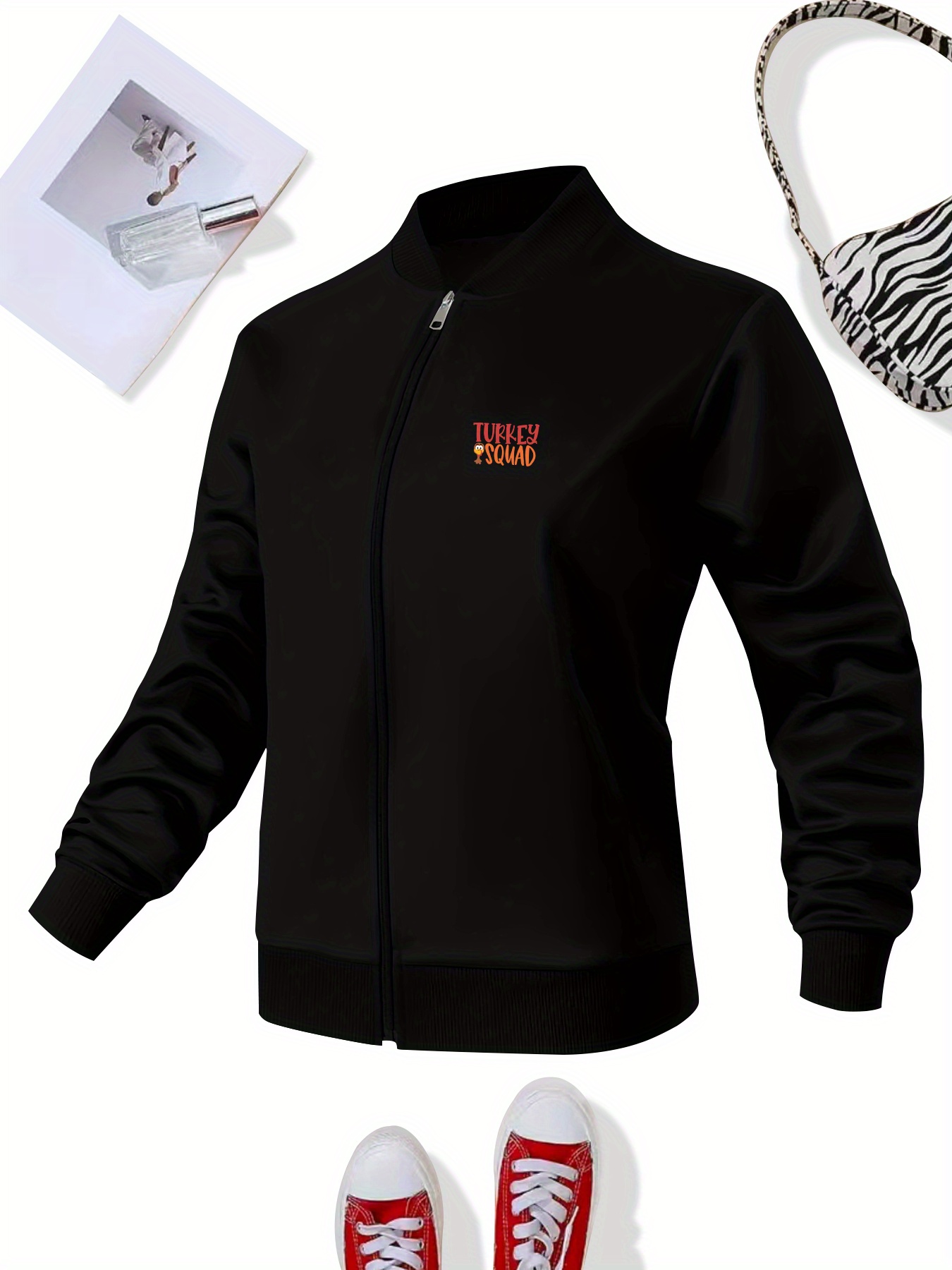 Women's Turkey Squad Graphic Zip-Up Jacket - Black Casual Slim Fit Stand Collar Coat with Pockets, Machine Washable Fall Winter Outerwear
